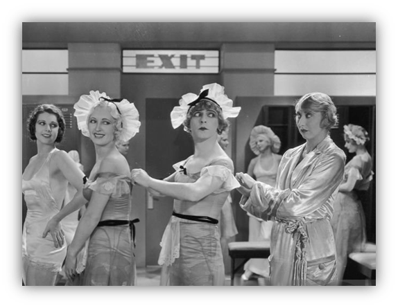 Only a few scenes of Flaming Youth survive, mostly involving party scenes and Coleen looking at herself in a vanity mirror, applying fake beauty spots and dousing herself with dangerous quantities of perfume and talcum powder. This may have something to do with the fact that she had recently launched her own range of perfume and talcum powder.