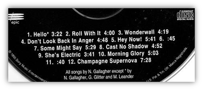 That is true, but the first 12 seconds of Track 1, “Hello”, is just Noel strumming the chord progression to “Wonderwall”, as though it’s playing in the background on the radio, as if he knows that it will very soon be constantly playing in the background on the radio. Like he’s foreshadowing a world where everybody will constantly be strumming the chord progression to “Wonderwall.”