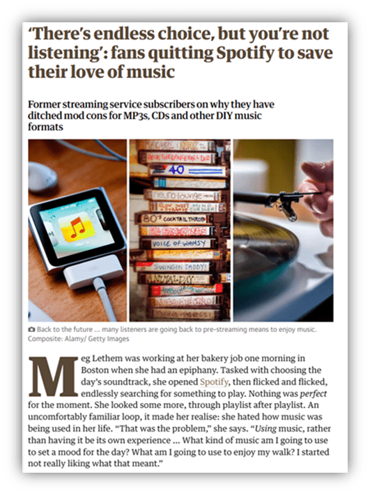 I thought that the 2022 article “Fans quitting Spotify to save their love of music” focusing on Meg: