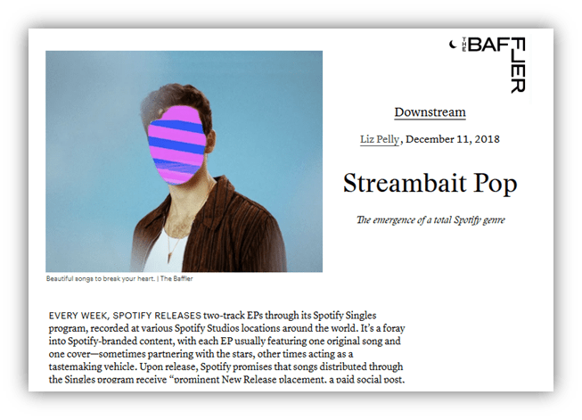 When the anti-Spotify opinion-piece writing industrial complex talks about “vapid playlists” and genres, there’s one specific kind of playlist and one specific genre they are generally talking about. It’s a genre they made up themselves: Spotify-core aka “The Spotify Sound” aka Streambait Pop: