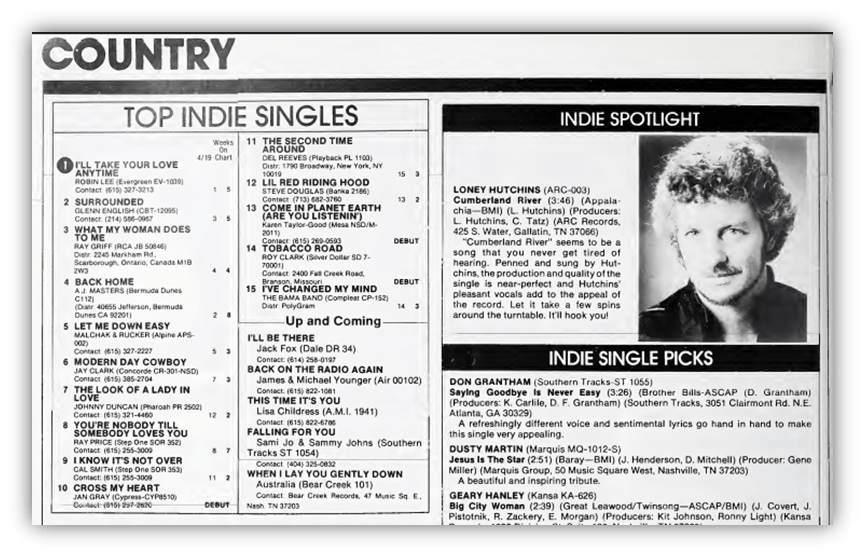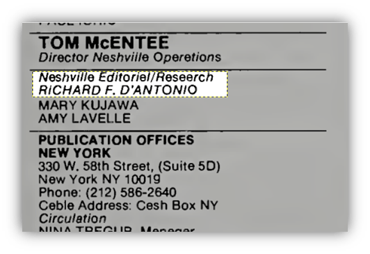 He was put in that role by Richard “Tony” D’Antonio, the chart operations director for Cash Box’s Nashville office.