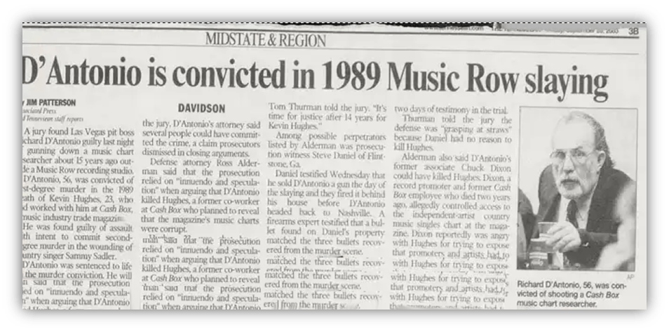 The deceased Dixon was never charged, but D’Antonio was tried for first degree murder. Several promoters and Cash Box employees testified to the culture of chart manipulation at Cash Box, and tensions involving Dixon, D’Antonio, and Hughes.