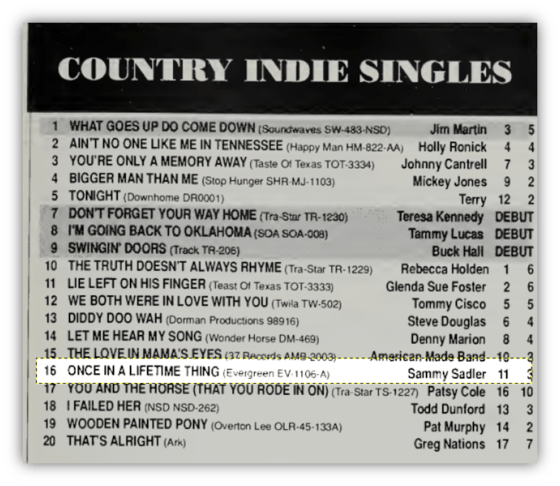 In the remaining months of 1989, Sadler’s songs appeared on Cash Box charts several times.
