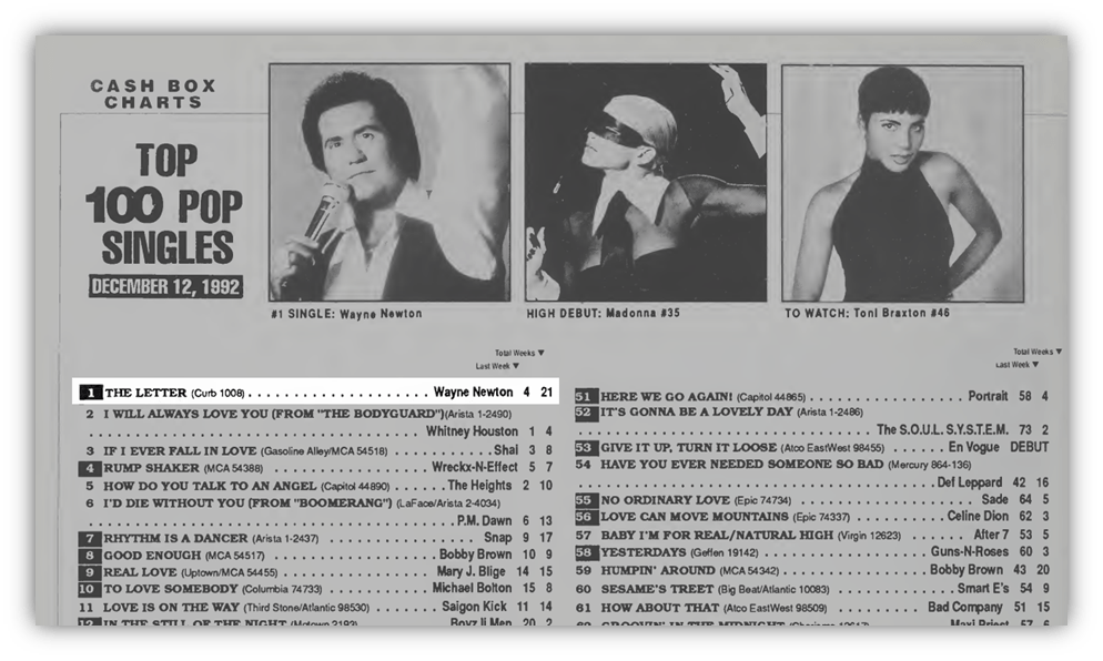 Just as Whitney Houston’s very own ballad, “I Will Always Love You”, reached its third week at #1 on its way to becoming a chart juggernaut, the song was interrupted by “The Letter” on the Cash Box charts: